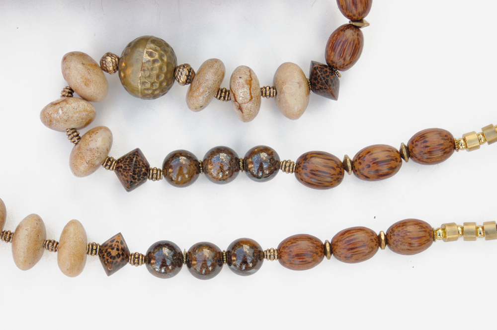 with bronze colored hanging beads and topped with soft taupe organza flowers.