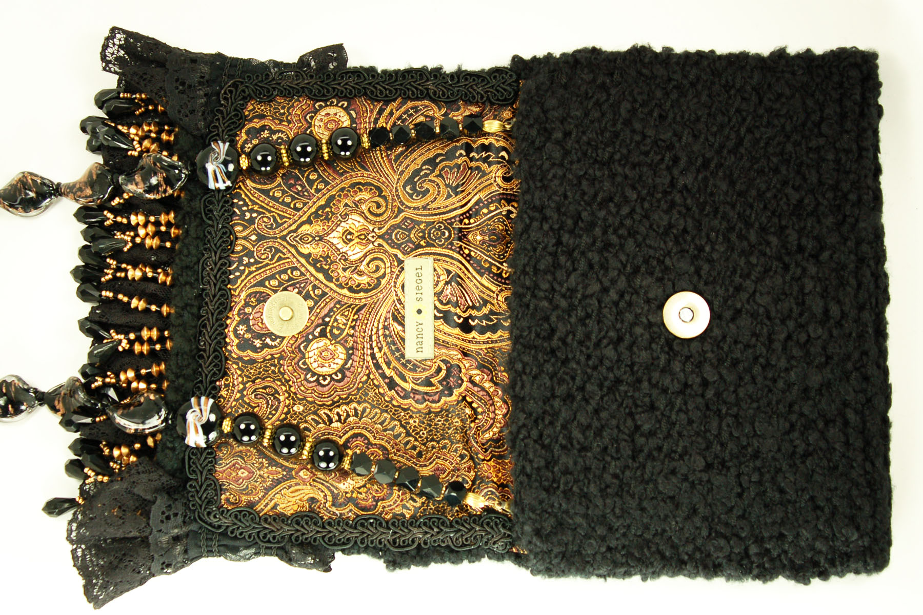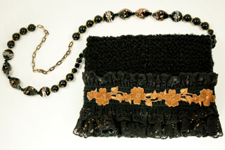 trimmed in a row of black lace, topped with a wide black lace band that straddles a row of embroidered copper flowers and leaves. Below the row of black lace hang long gold and black beads.