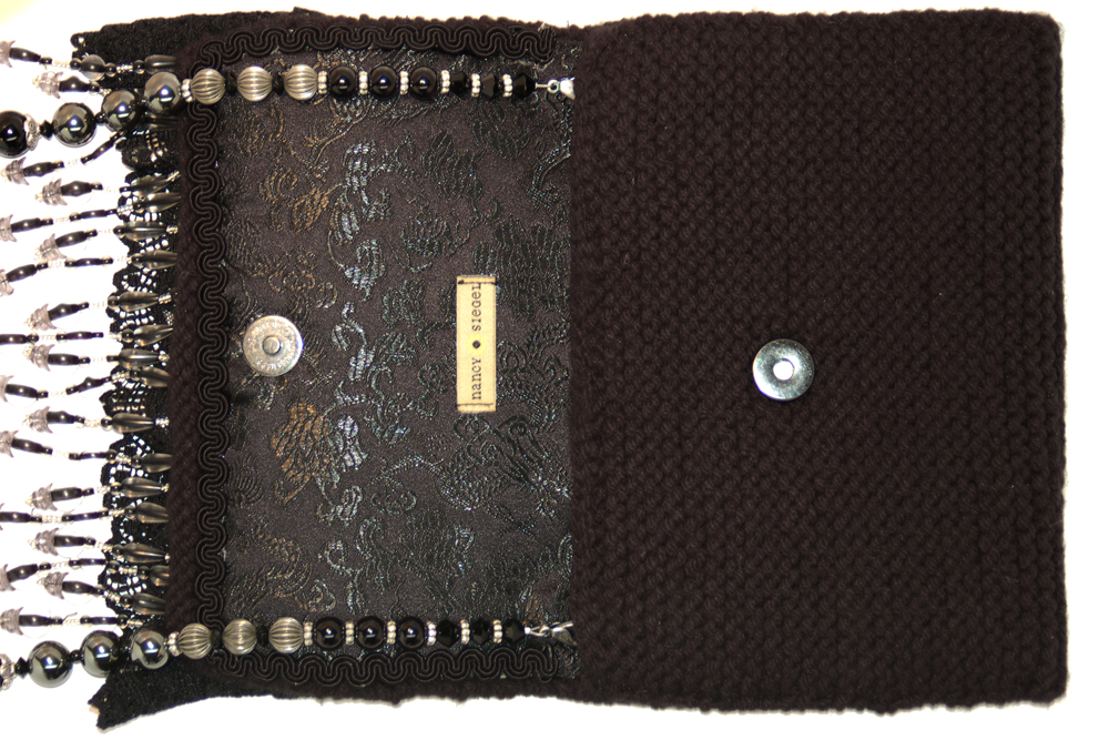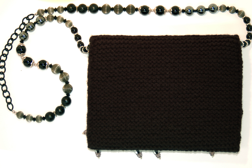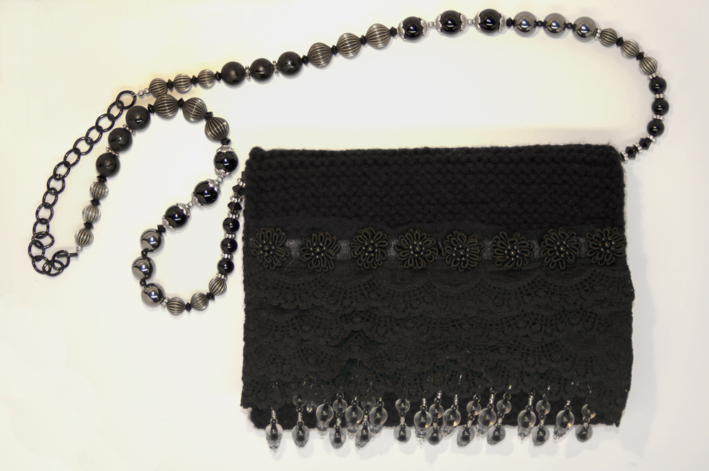 a multitude of black, silver and hematite beads. A black chain allows the purse to rest comfortably on the shoulder. In addition, the strap is removable, allowing the bag