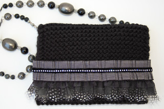 It is crafted of a soft black yarn. The embellishment on the top flap is trimmed in a double row of black and white feathers, topped with a sheer black trim. The top trim is black and white pleated plaid with a row of strung rhinestones running the entire width of the purse.
