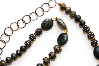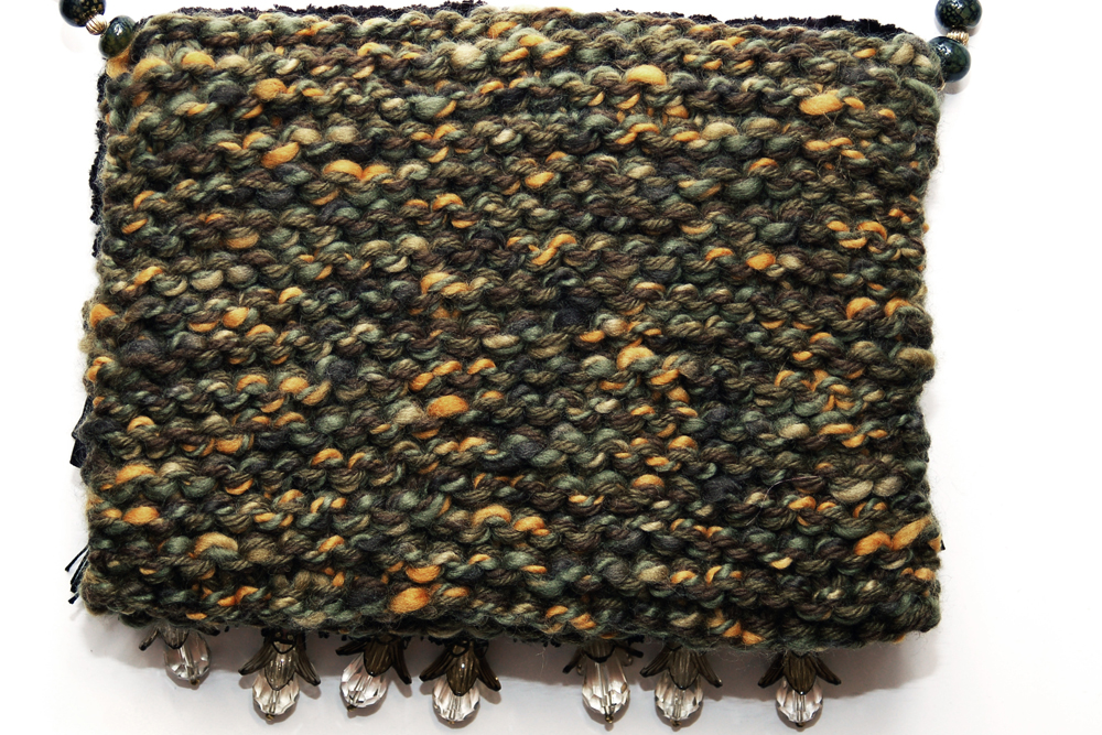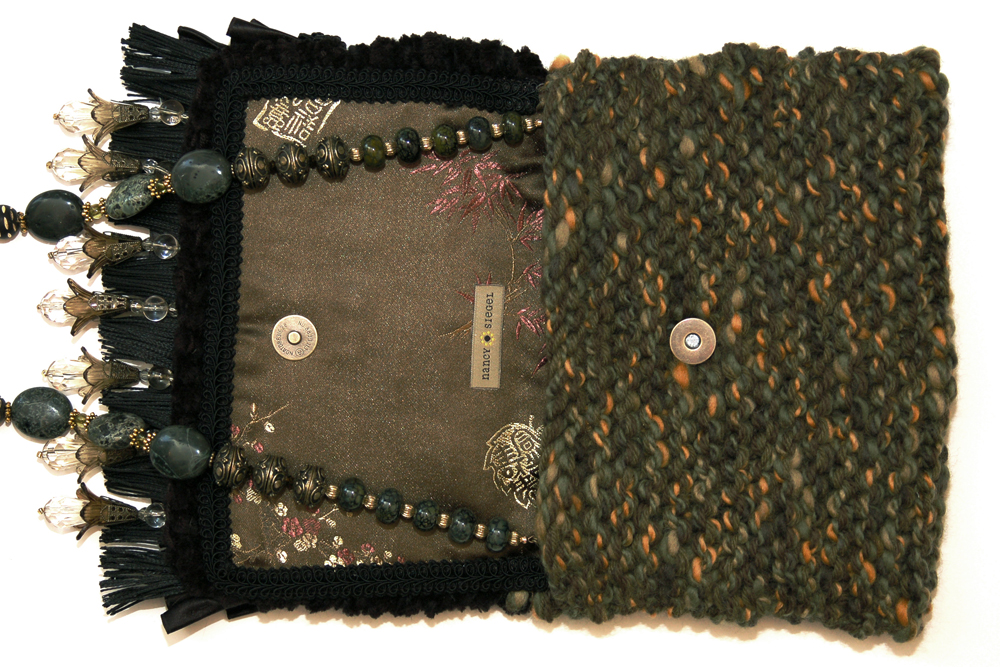 The flap of the purses is constructed of soft black chenille yarn. The embellishment on the top flap consists of a row of black fringe, a double row of black satin ruffle, which is topped with a fow of black carnations. The carnations have black beaded centers. Hanging beads, topped with dark green metallic caps hang below the fringe.