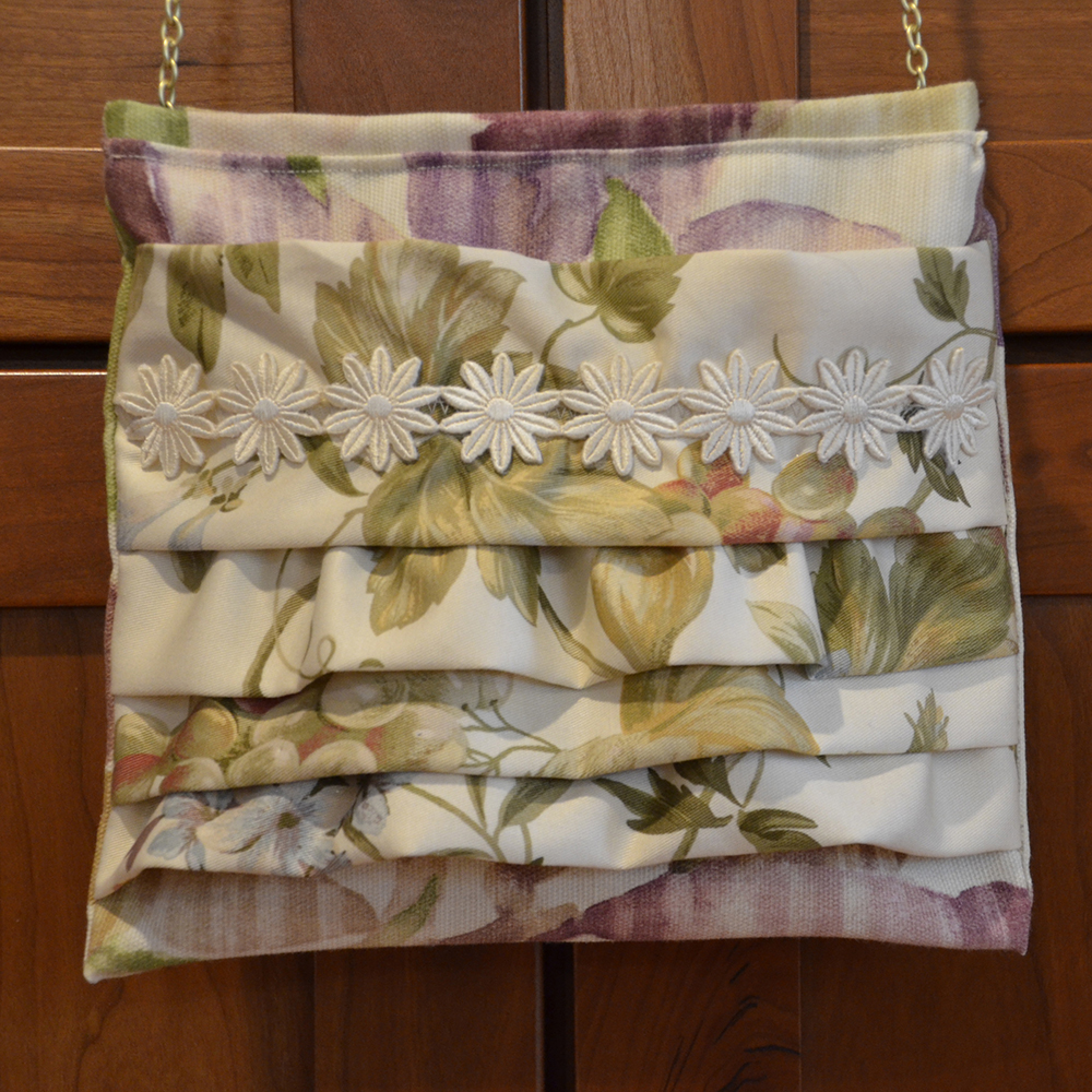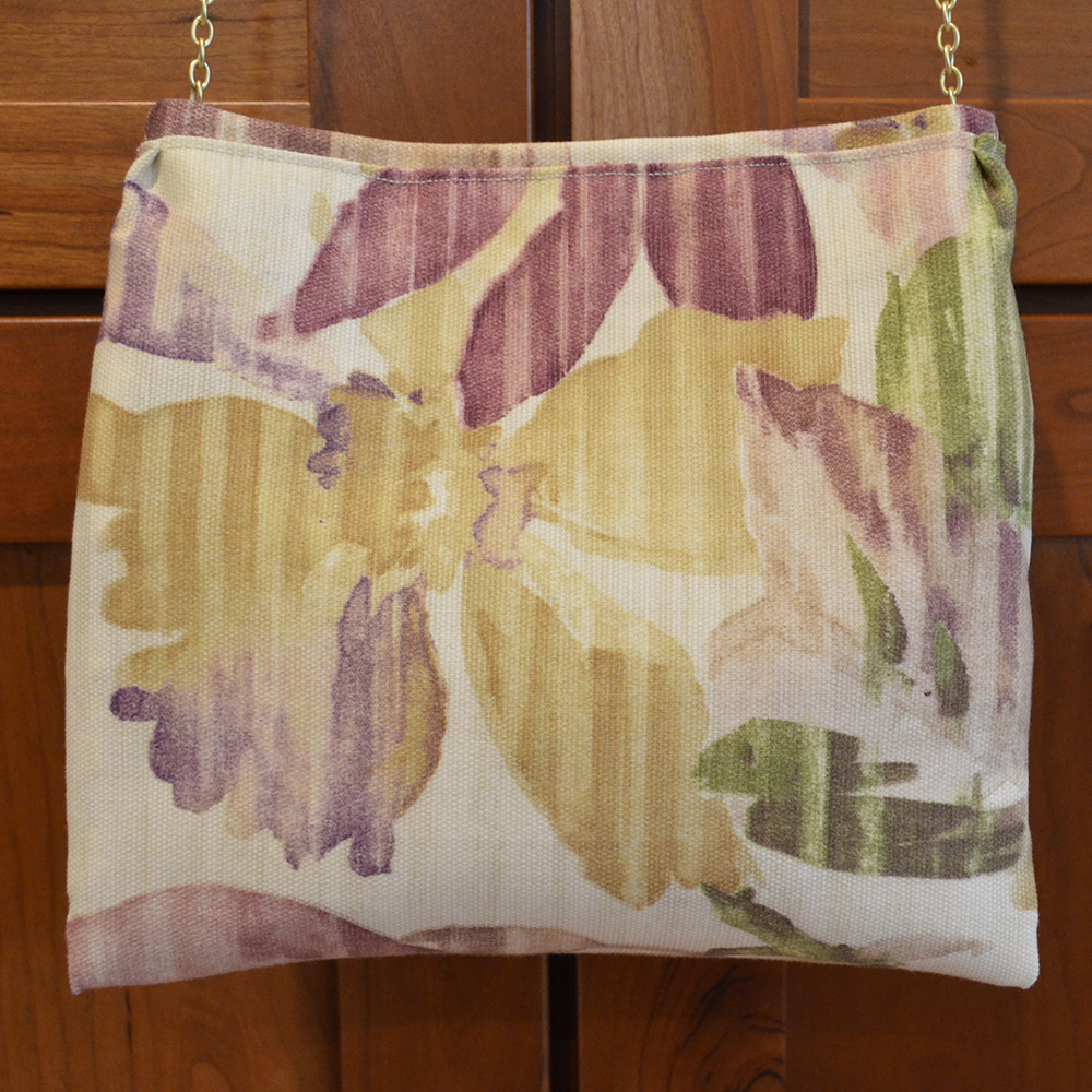 "Floral Cream" measures 8"W x 7 3/4"H and is constructed both inside and out of woven cotton floral print in shades of rose, purple and green set upon an ivory background. The front of the bag is layered with soft ruffles in the same tones as the body of the bag. A daisy flower appliqué in ivory brings out the neutral cream background in the cotton print. A removable gold chain drops the purse about 18" from the shoulder.