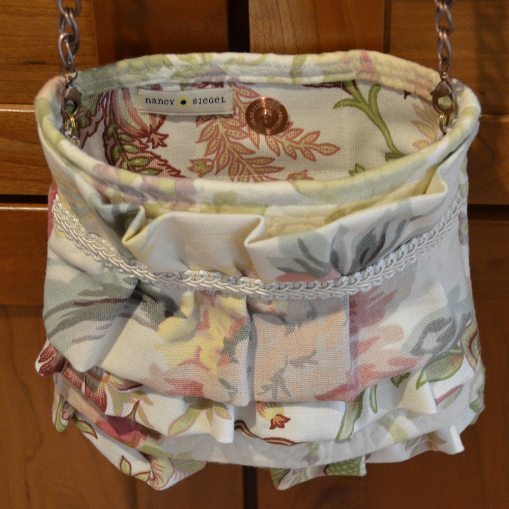 "Garden Party" measures 7 3/4"W x 7"H and is constructed both inside and out of woven cotton floral print in shades of rose, pink and green set upon an ivory background. The front of the bag is layered with soft ruffles in the same tones as the body and the inside of the bag. A woven trim in ivory brings out the neutral cream background in the cotton print. A removable deep copper chain drops the purse about 18" from the shoulder.For additional information