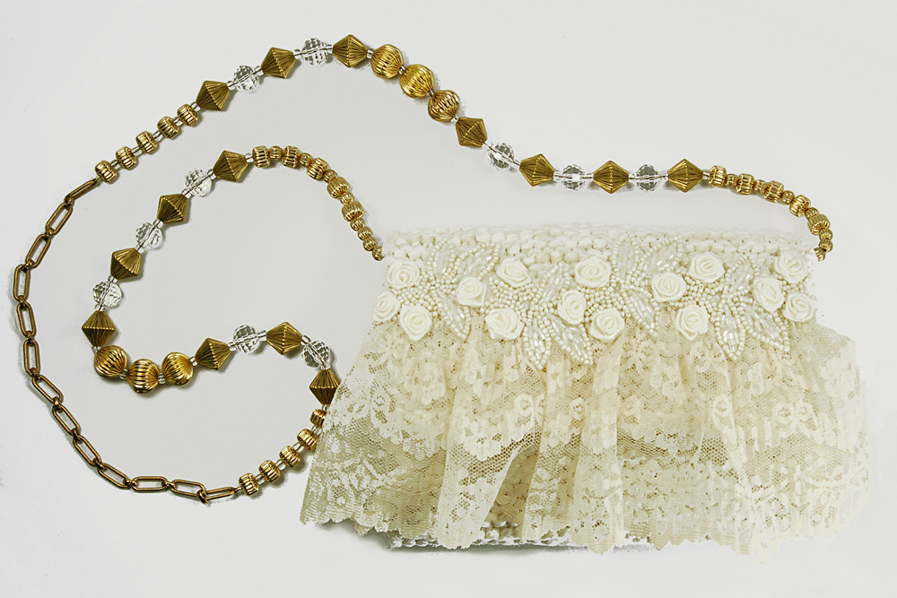 a combination of faceted glass beads and gold-tone beads. A gold-colored chain allows the purse to rest comfortably on the shoulder. In addition, the strap is removable, allowing the bag to be carried as a clutch. The purse has a magnetic snap closure.