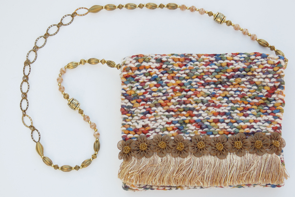 Jewel Daisy measures 7"W X 6.25"H. It is created with two yarns; a soft multi-colored jewel tone yarn in combination with a coordinating ribbon yarn. The embellishment on the top flap is trimmed with a gold fringe and topped with deep gold organza flowers that run the width of the purse.In keeping with the yellows and golds in the yarn, the interior of the bag is lined with a multi-toned gold fabric with accents of color that coordinate beautifully with the body of the purse.The strap is 32" long. It is designed with