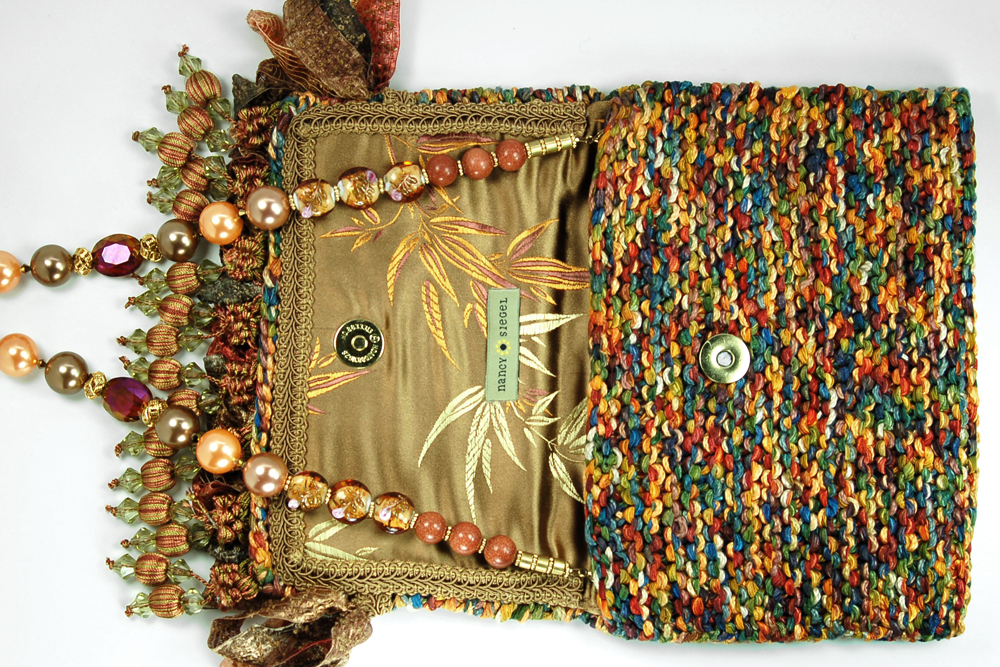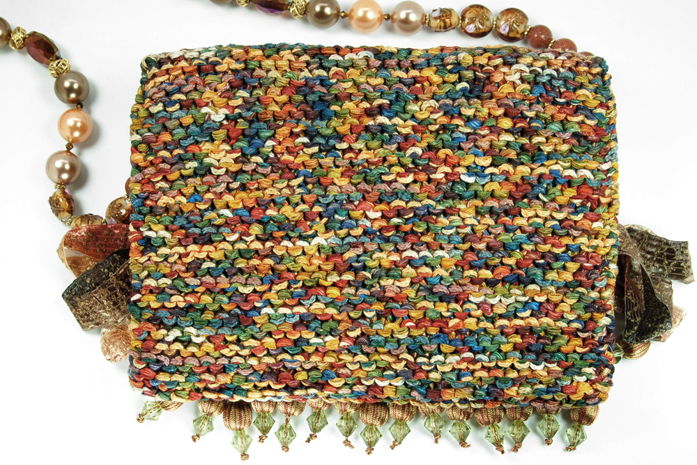 Jeweled Sunset measures 7.75"W X 6."H. It is created with two yarns; a very soft multi-colored yarn in combination with multi-colored ribbon yarn. The embellishment on the top flap consists of a multi-colored soft silky feminine ruffle that is trimmed with a coordinating woven band. Hanging just below the ruffle is a row of translucent lime colored beads and woven beads.The interior of the bag is lined with a soft goldtone fabric that coordinates beautifully with the body of the purse.The strap is 34" long. It is designed with