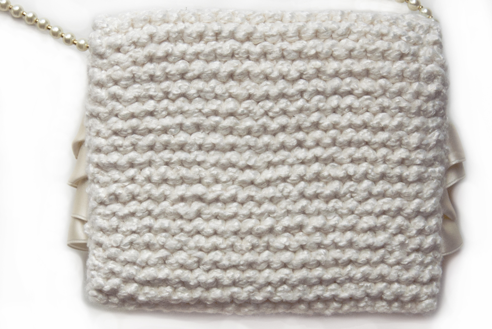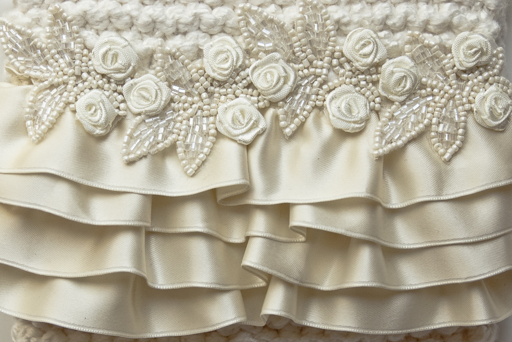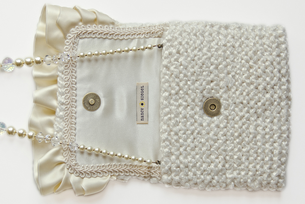 Matrimonial Ruffle measures 6.25"W X 5.25"H. It is created with a very soft textured ivory yarn. The embellishment on the top flap consists of a 4 rows of ivory satin ruffle that is topped with a row of beautiful beaded trim dotted with soft ivory miniature roses.The interior of the bag is lined with a soft white satin fabric that coordinates beautifully with the body of the purse.The strap is 37" long. It is designed with varying sizes of faceted glass beads and pearls. A gold-colored chain allows the purse to rest comfortably on the shoulder. In addition, the strap is removable, allowing the bag to be carried as a clutch. The purse has a magnetic snap closure.For additional information about Matrimonial Ruffle, please email me. I'd love to hear from you!nancy@nancysiegelpurses.com |