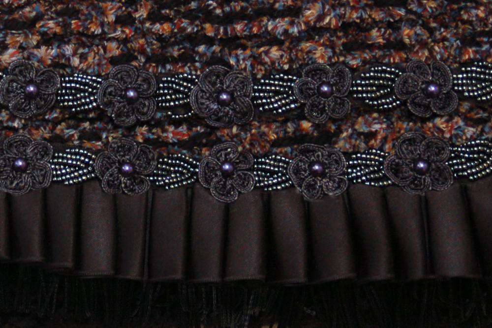 The body of the purse is constructed from a very soft black textured yarn, while the flap of the purse is a soft chenille yarn of multiple shades of blue, red and tan. The embellishment on the top flap consists of a row of black fringe, topped with a row of black satin ruffle and the finally topped with two rows of embroidered gunmetal colored flowers with patches of hematite beading in between.