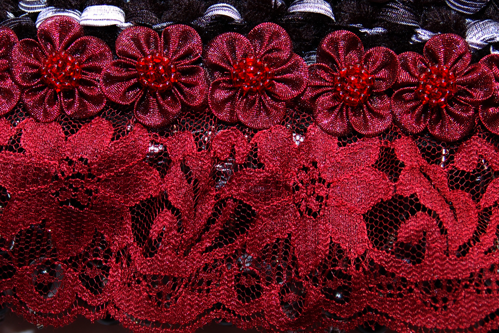 It is constructed of a combination of black chenille yarn and black and silver ribbon yarn. The embellishment on the top flap consists of a row of red lace topped with a row of ruby organza daisies. Blackand translucent bead strands hang from under the lace.