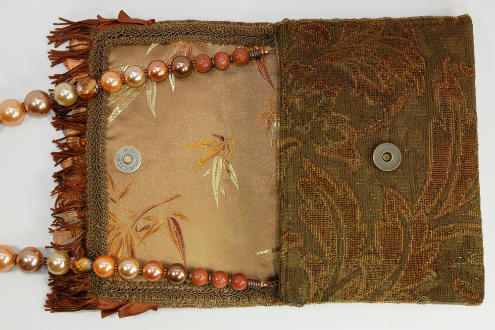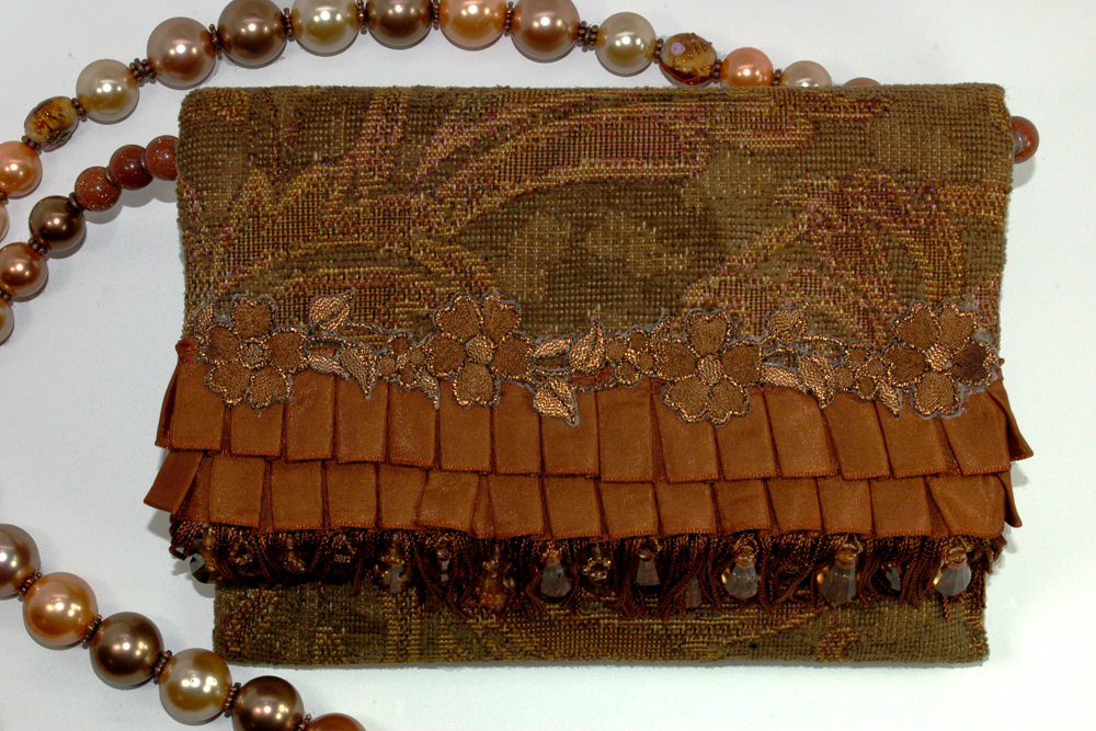 Ruffled Copper measures 7.5" W X 6" H. It is constructed of tapestry fabric in copper and brown tones and is adorned with a row of translucent copper beads, topped with row of copper fringe. Added to that is a double row of copper pleated satin ruffle which is finished with a copper flower applique. This bag is completely lined with a coordinating fabric. The strap is made with various glass beads, dotted with a few beautiful lampwork beads. A copper-toned chain rests comfortably on the shoulder. The strap is removable to allow the bag to be used as a clutch and the strap to be worn as a necklace!