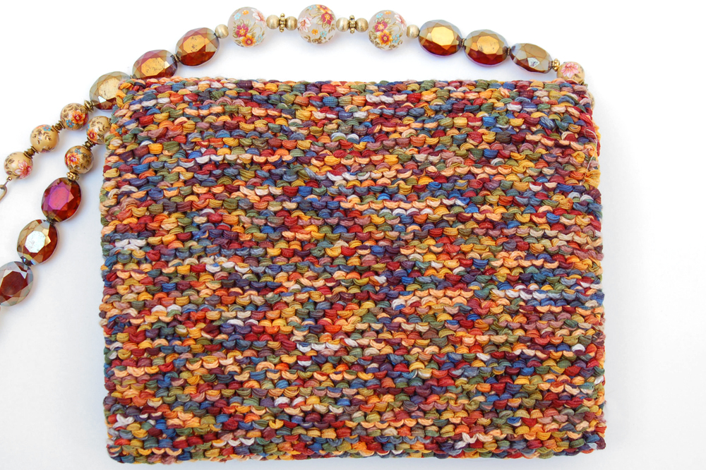 Ruffled Jewel measures 7"W X 6"H. In deep jewel tones, this purse brings warmth to the look of almost any outfit. With copper as a main accent, the colors in the purse combine together to give an overall depth of rich jewel shades. The top flap is embellished with 4 layers of varying texture and color, while all staying within the same overall color scheme. The bottom layer is the deepest in the copper family as the fringe provides a delicate background for the layers to come. It is topped with a row of fabric beads that complement the colors in the yarn and becomes a transition between the fringe and the next layer of pleated grosgrain copper ruffle. The top layer finishes it off with a copper and rose floral applique.
