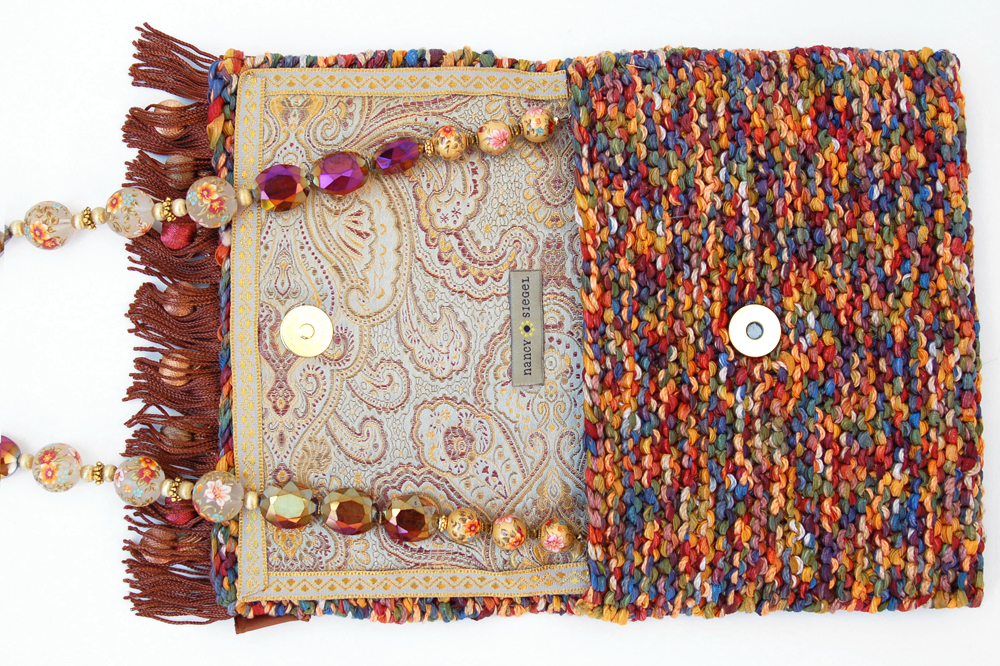 The inside is lined with a perfectly matched print fabric that picks up the colors used throughout the bag.