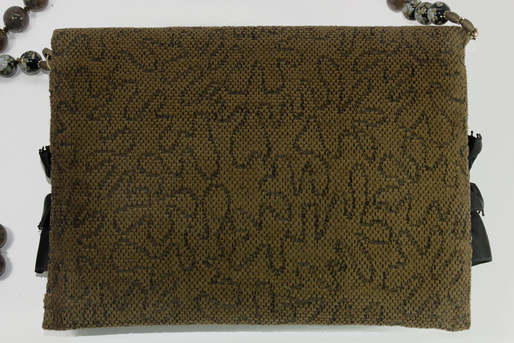 Ruffled Moss measures 8.5"W X 6.5"H.Maybe not such an attractive name (Moss) for such a beautiful purse but it truly describes the color! It is constructed of a soft green fabric - like a chenille, with a loose "squiggly" pattern almost "etched" into the fabric surface. And although the fabric is soft, the bag is lined with a fairly structured interfacing that allows the purse to maintain it's shape. The flap is adorned with a row of black hanging beads that is topped with a black satin piquot gathered ruffle. Black miniature satin bows dot the center of the ruffled row.The inside of the bag is fully lined with a deep green patterned fabric and is edged with a black woven trim.The strap is about 40" long and is hand-beaded with marbelized glass beads, cloisenne influenced black beads, as well as various brass colored beads. A gold-tone chain rests comfortably on the shoulder.In addition, the strap is removable so the purse can be carried as a clutch. |