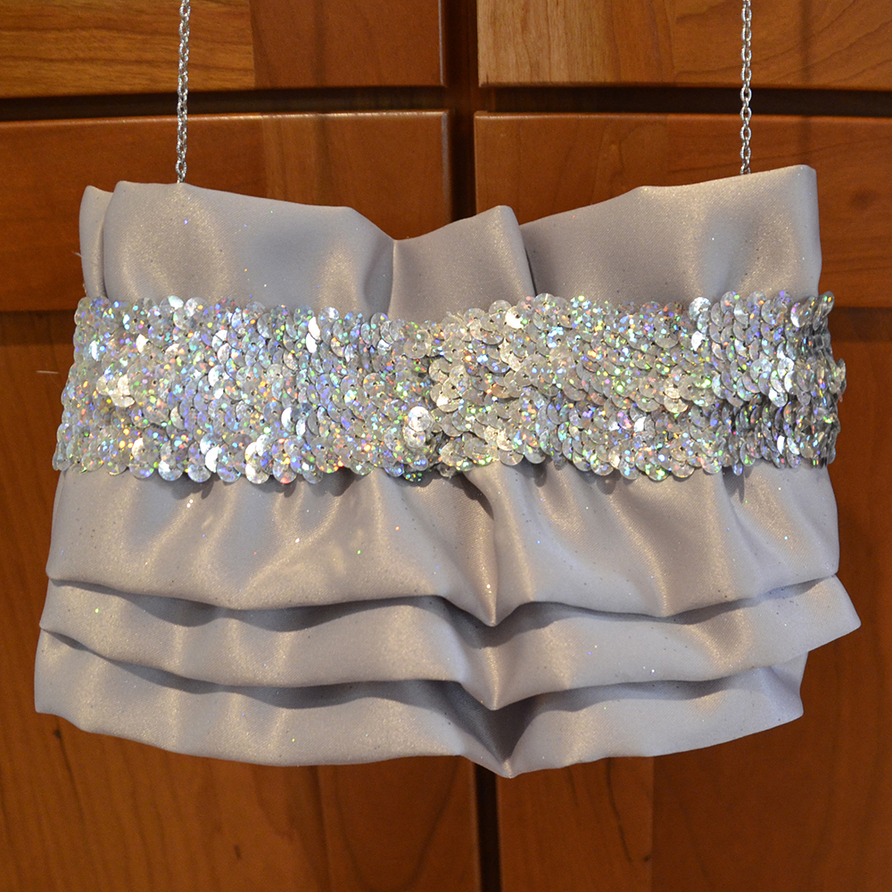 "Silver Sequin" measures 8"W x 5 1/2"H and is constructed both inside and out of a very pale grey satin fabric with subtle glitter within the fabric. The front of the bag is layered with soft ruffles in the same fabric as the body of the bag. A sequin band wraps around the whole bag, about one inch from the top. A rhinestone pin sits in the center of the band on the front of the bag. A removable silver chain drops the purse about 20" from the shoulder.For additional information about "Silver Sequin", please email me. I'd love to hear from you!