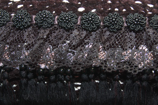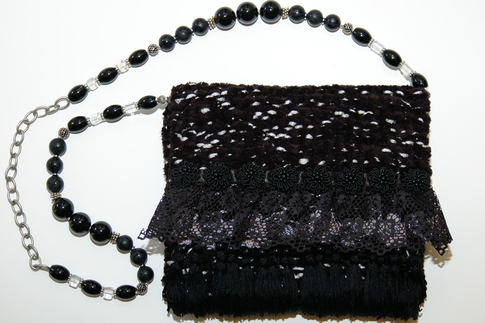 Starlight Rose measures 8"W X 8"H. It is created with two yarns; a very soft black yarn in combination with soft silver yarn. The embellishment on the top flap consists of a row of black fringe bordered by silver flowers and topped with a row of black lace that is edged with black woven zinnia flowers.The interior of the bag is lined with a silky black and silver patterned fabric that coordinates beautifully with the body of the purse.The strap is 34" long. It is designed with